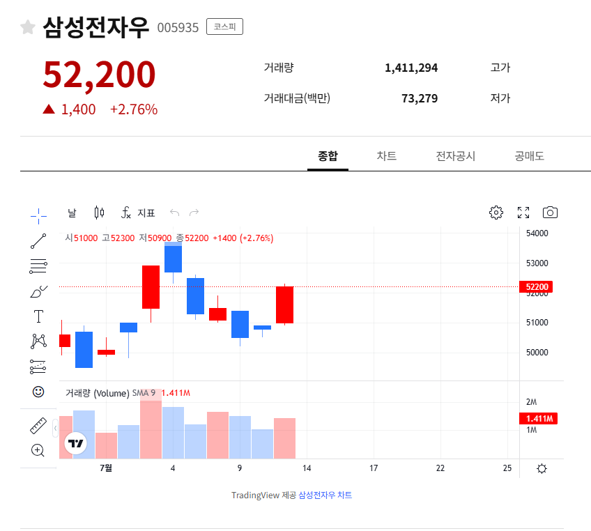 2025년 7월 10일 기준 외국인은 204,000주, 기관은 27,000주의 순매수를 기록했다. 이는 단기 상승세에 외국인과 기관의 적극적인 매수세가 작용했음을 보여준다. 특히 외국인 지분율이 73.9%에 달해, 삼성전자우가 외국인 투자자들의 주요 관심 종목으로 부각되고 있다.